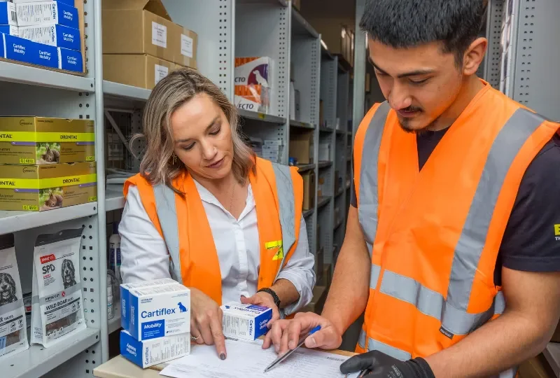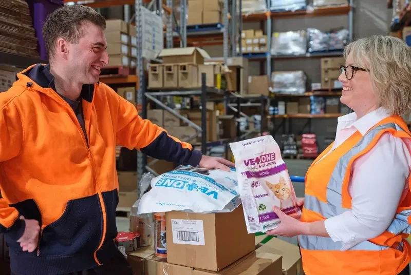 Warehouse staff wearing high-visibility vests walk through organised shelves of veterinary supplies, with one worker pushing a yellow cart loaded with items.
